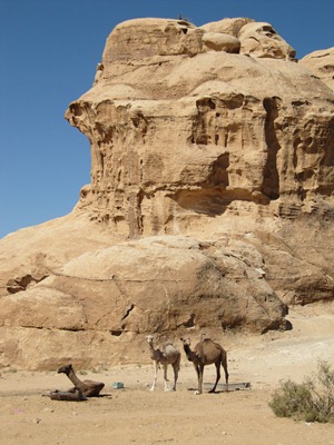 Wij hebben om 9:00 op de parkeerplaats van het visitors centre afgesproken en stipt op tijd staat onze chauffeur daar te wachten. De Fransen zijn wat later maar wij vervelen ons niet door een hond die daar loopt en Martin als zijn nieuwe beste vriend ziet. Als ook de Fransen er zijn rijden wij in een enorm gammele 4×4 weg langs Rum Village zo de woestijn in. Wij stoppen bij Lawrence Springs, Khazali Canyon, Little Rock Bridge (die wij uiteraard even moeten beklimmen), Umm Fruth Rock Bridge (ook deze moeten wij even bedwingen), Lawrence House, Anfaishiyya Inscriptions en The Red Dunes. Dan zijn de bijna 5 uur om en worden wij bij de entree weer afgezet. Wij bedanken de chauffeur en zeggen de Fransen gedag en gaan op weg naar Aqaba.