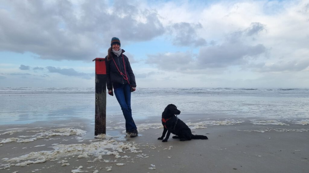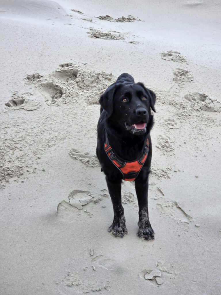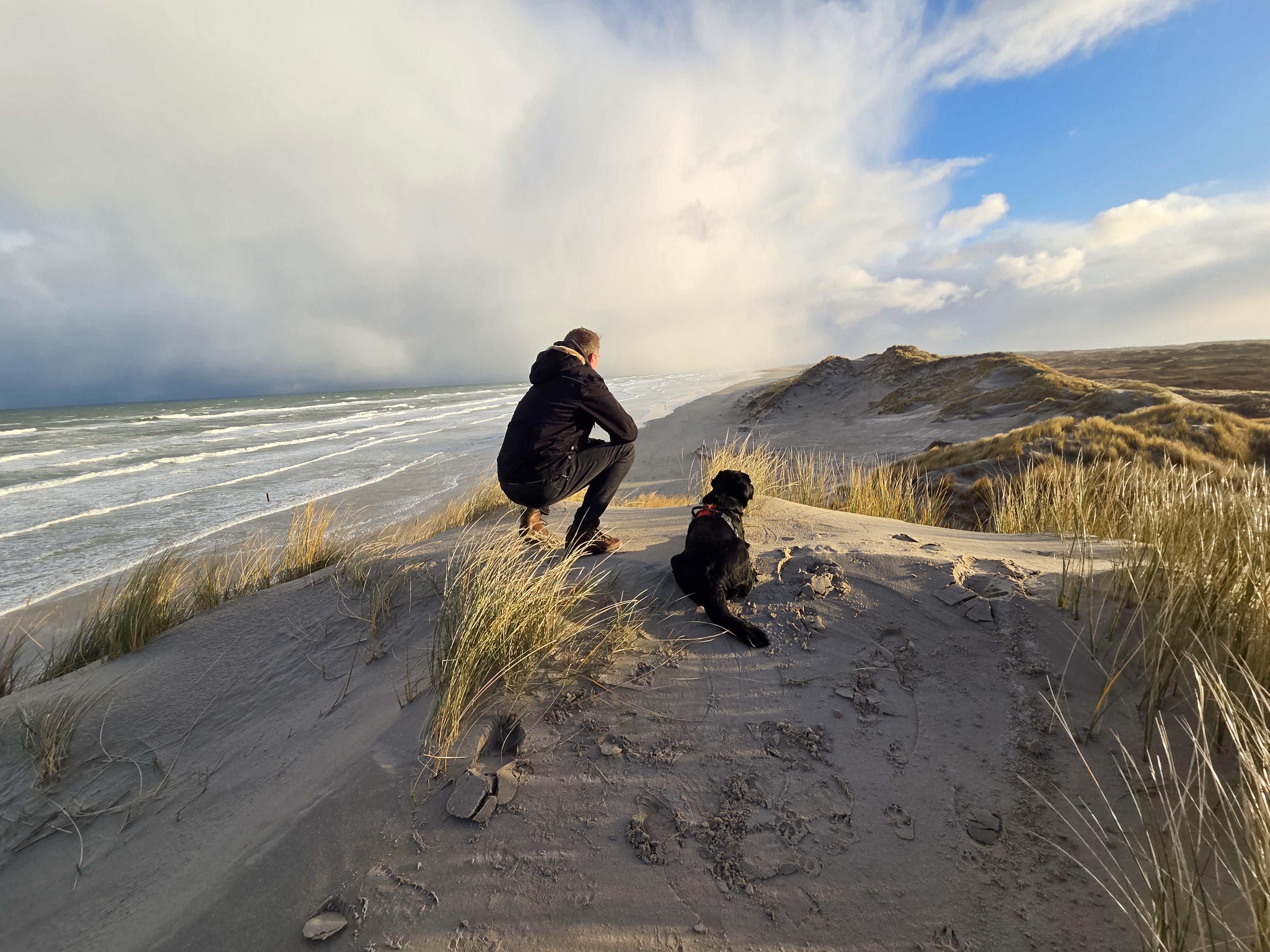 We worden wakker gemaakt door Obbe die toch wel heel graag naar buiten wil. Niet zo gek met de duinen voor je deur. Hij rent er heerlijk op los.
