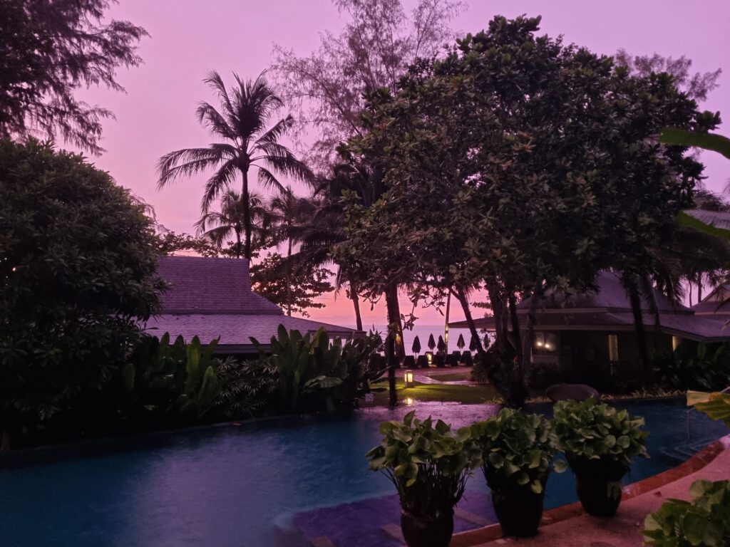 Niet heel veel later komen we bij Moracea Khao Lak beach resort aan. Het bevalt ons meteen. Bij de receptie worden we verwend met een verfrissend handdoekje en een heel zoet drankje. Niet veel later komt een golfkarretje om ons door de zandweggetjes naar ons de luxe huisje te brengen. En dat is het! Wat een heerlijk hutje. Niet zoals verwacht aan de zee maar wel aan een heerlijk zwembad. Snel omkleden en naar de strandtent om iets te eten.