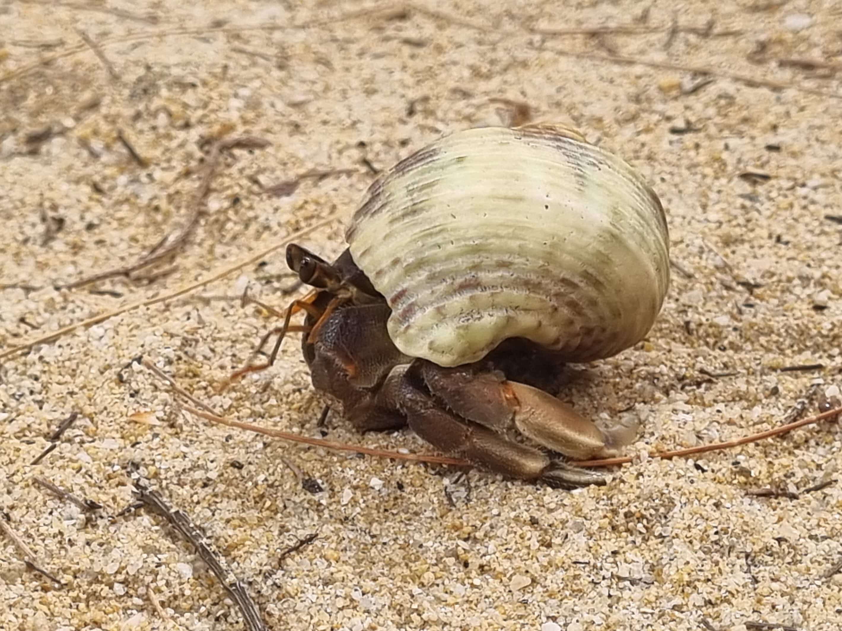 Het zou volgens de sites een regenachtige dag worden maar lijkt vooralsnog wel ok te zijn. We liggen in ieder geval prima. Mart leest en ik ben lekker de hermietenkreeftjes aan het volgen en maak daarna even een wandeling over het strand. Genieten.