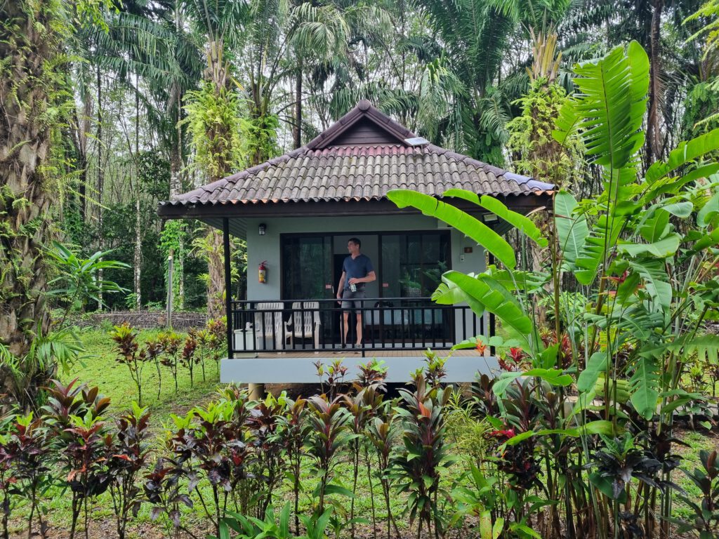 Na een kwartiertje wachten staat stipt op tijd onze transfer naar Khao Sok voor de deur. We hebben een prive transfer want dat was voor 2 bijna net zo duur als een gedeelde transfer. Het is een rustige rit met veel rubberplantages en voordat we het weten, komen wij tegen 13:00 bij het Khao Sok in Palm Garden Resort aan.