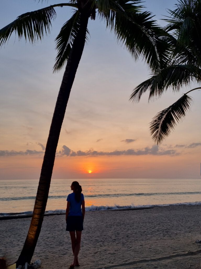 Na het dumpen van de bagage gaan we richting strand wat ook dichtbij deze kamer ligt. De zon schijnt volop en een plekje in de schaduw vinden, is niet zo eenvoudig. Als we ook die hebben, is het rustig wachten tot de zon onder gaat. Na een korte wandeling en een duik in de enorm rustige zee gebeurt ook dat in alle kleuren van de regenboog.